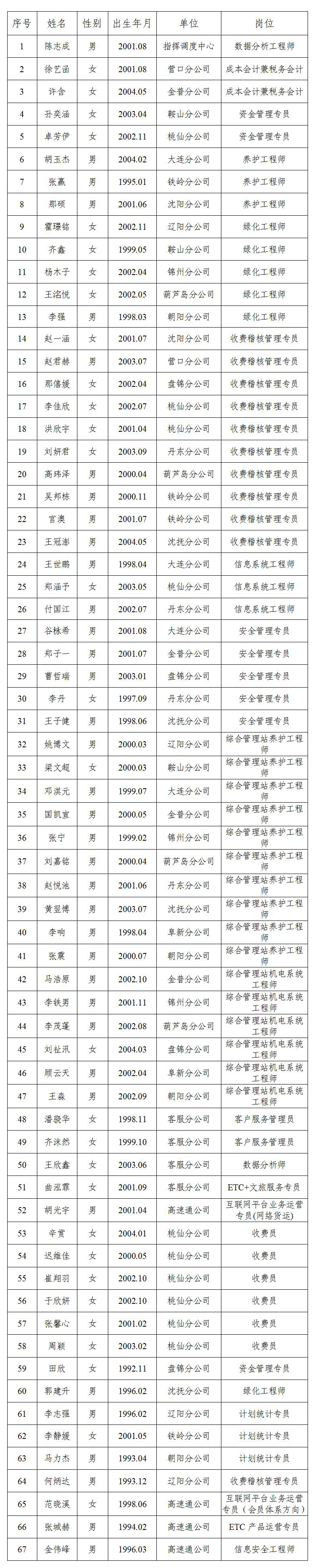 根据辽宁省高速公路运营管理有限责任公司招聘工作有关要求,经过资格审核、笔试、面试、考察、体检等程序,确定以下人员为拟聘用人员,现予以公示。公示期间如有问题,请向辽宁省高速公路运营管理有限责任公司致电反映。